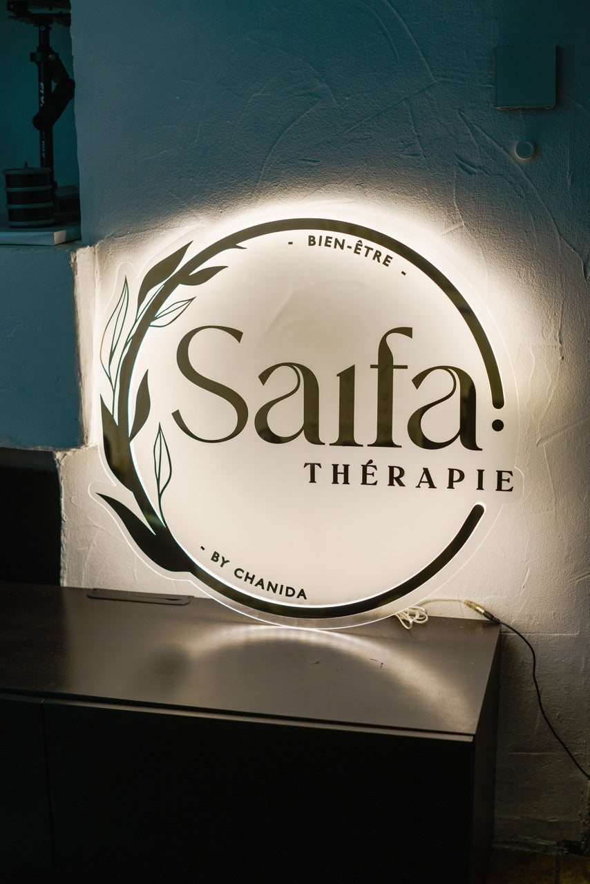 Saifa Thérapie by Chanida, VeveyEnseigne acrylique "frost" avec éclairage arrière, Logo en découpe métallique effet Or Chromé