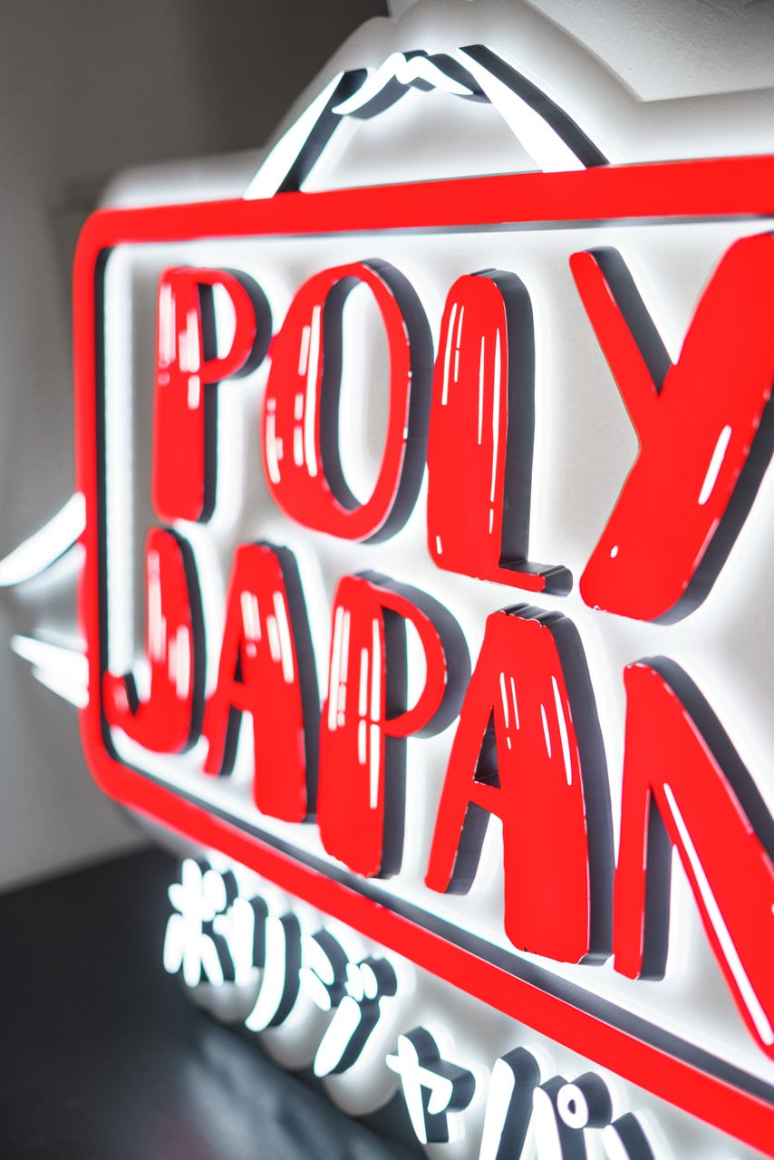 PolyJapan, EPFL LausanneEnseigne Acrylique 3D avec éclairage arrière et rétroéclairage des lettres; sur plaque acrylique découpée sur mesure